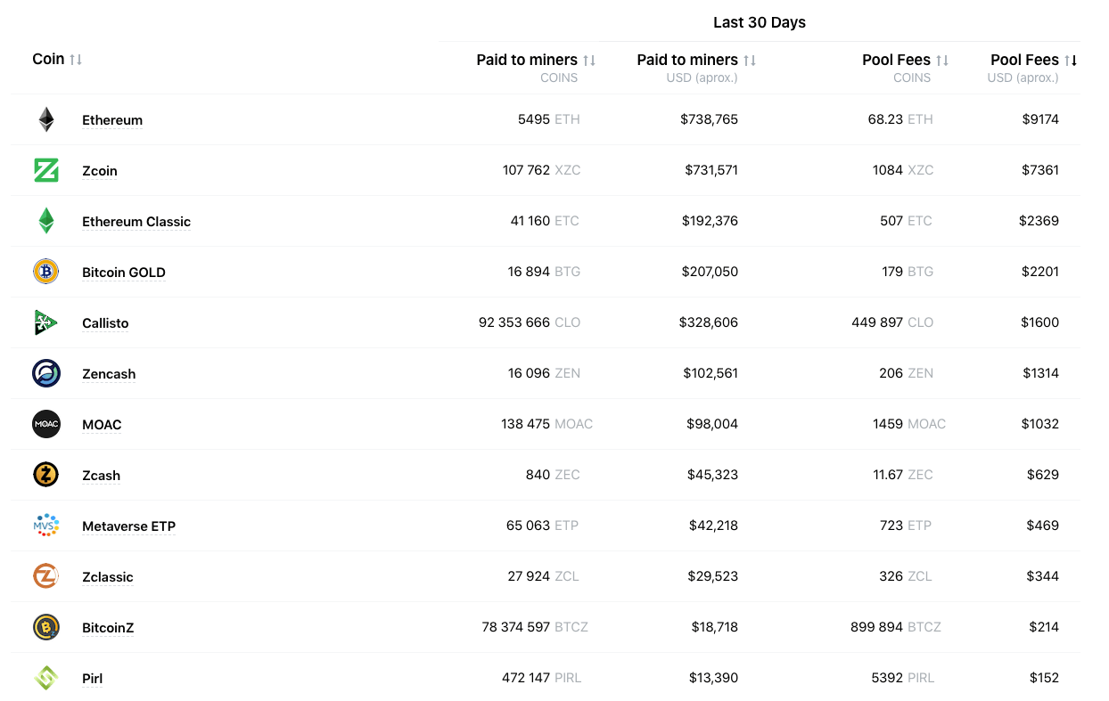 - Zcoin. Payout to miners – 107,192 XZC or 698,963 dollars, pool fees – 1,105 XZC or 7,211 dollars.