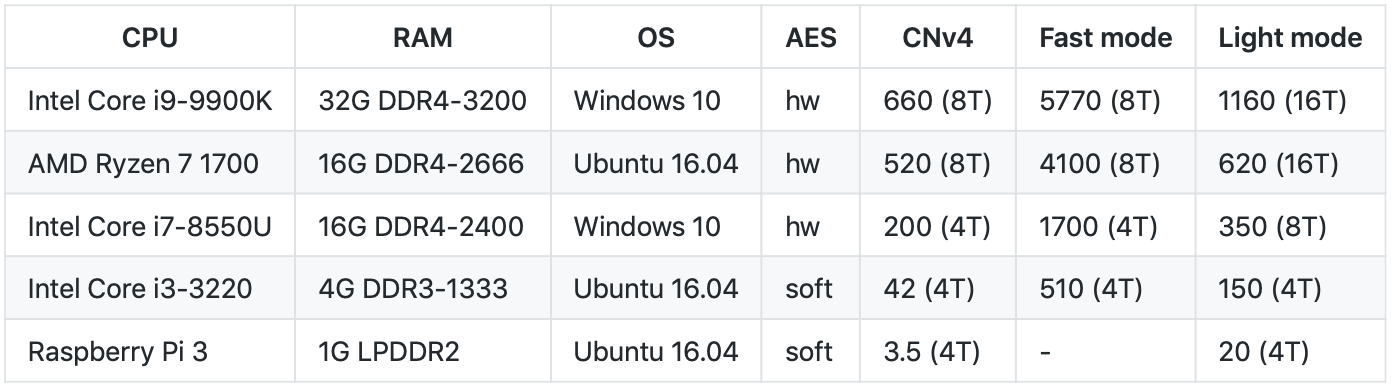 The developers shared the performance of selected CPUs that use the optimal number of threads (T) and show results in hashes per second (H/s). “CNv4” refers to the CryptoNight variant 4 (CN/R) hashrate.