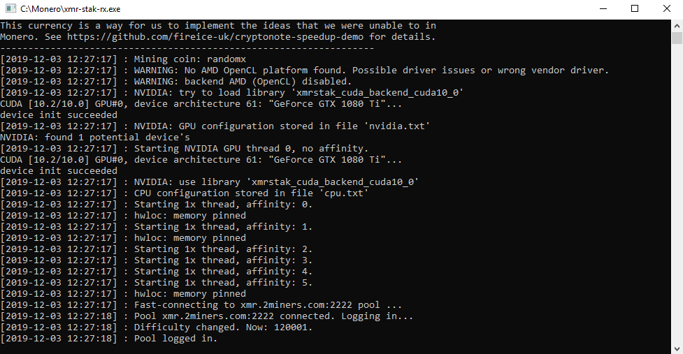 XMR-STAK will automatically define which mining hardware do you have: NVIDIA GPU, AMD GPU, CPU. Now the mining is running.