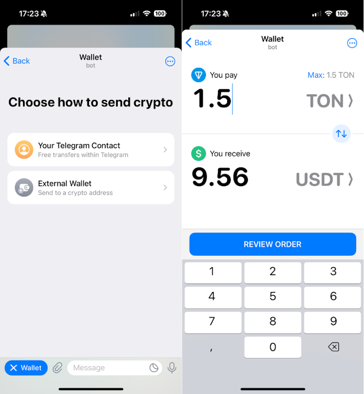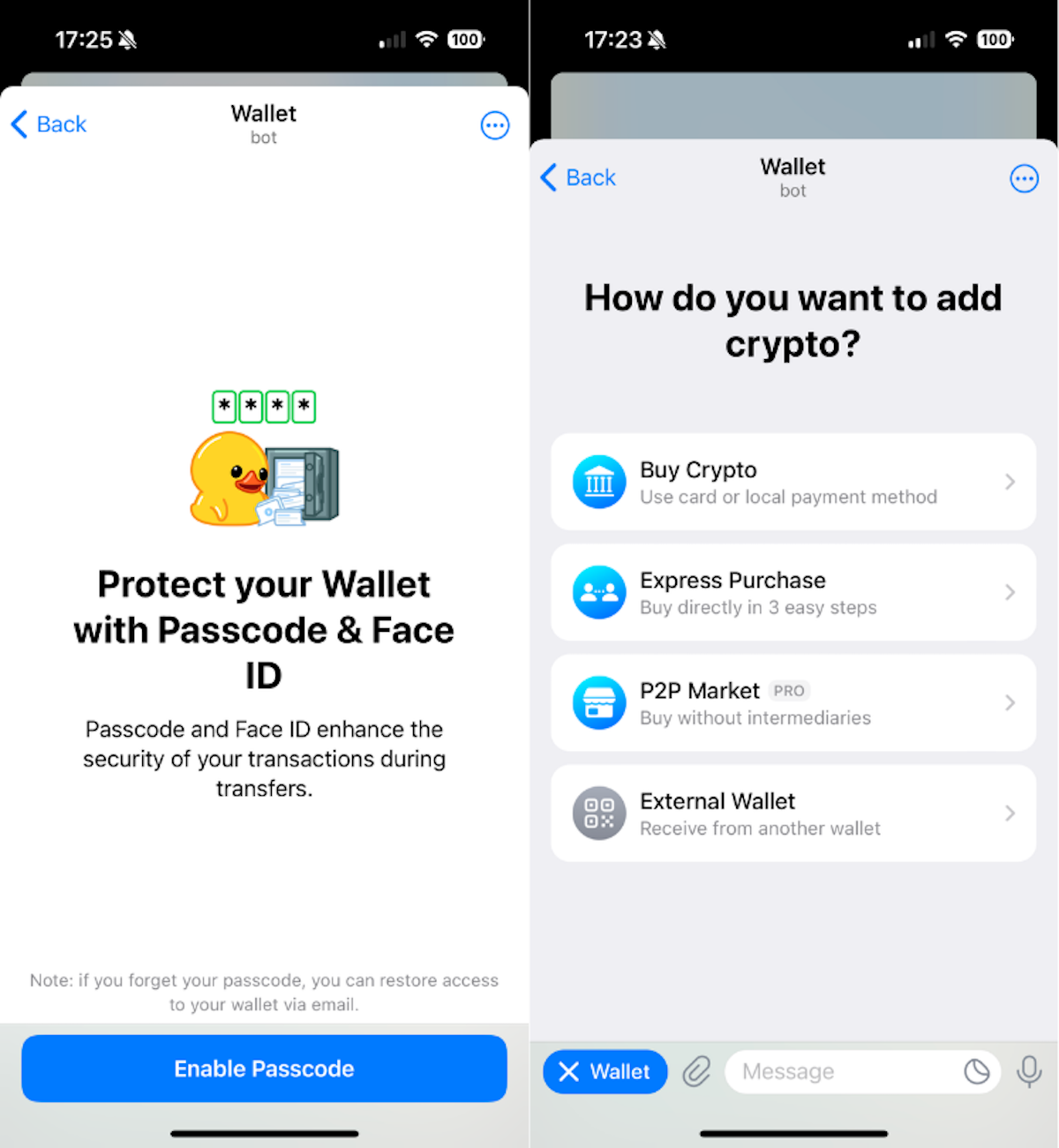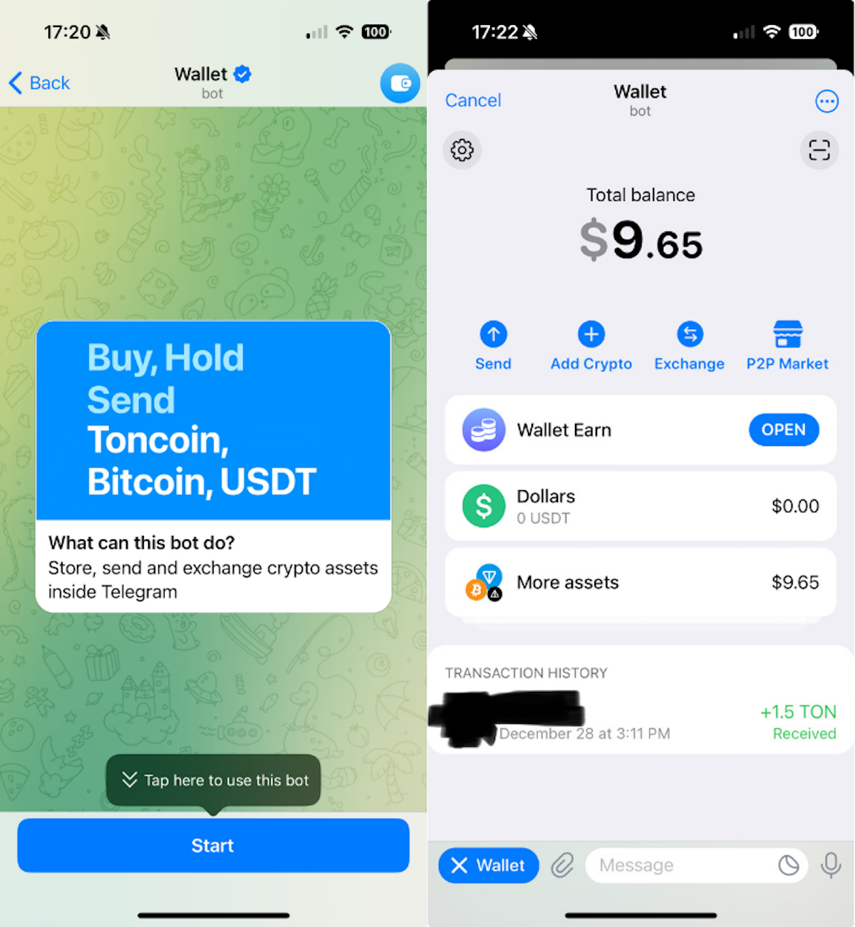 Toncoin can be used directly in the Telegram messenger. To do this, simply search for @wallet and activate the wallet using the “Start” button. The wallet interface will open directly in the application.
