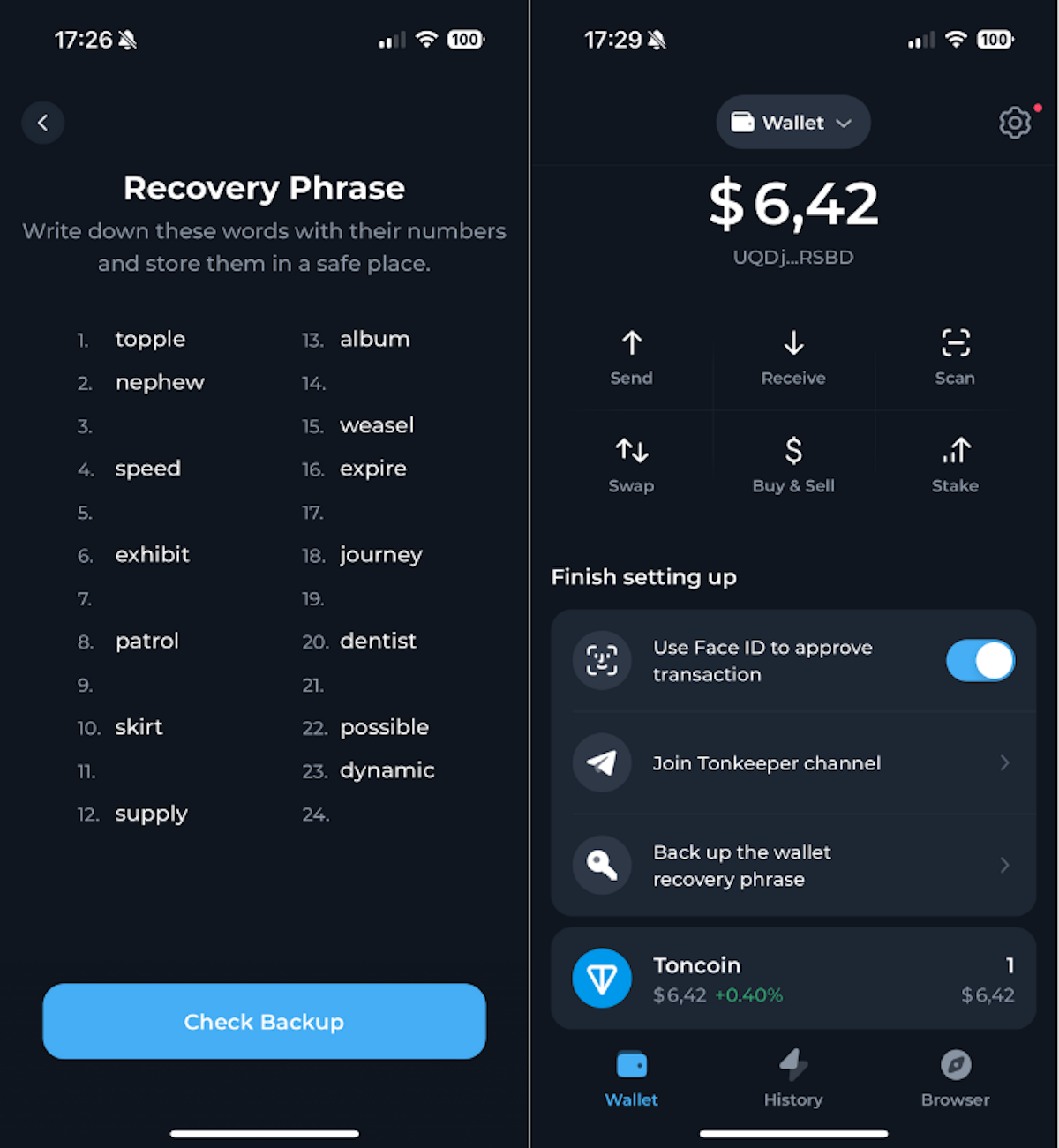 For additional convenience, access to the wallet can be secured with a password and Face ID. In case of a forgotten password, it can be recovered via email.