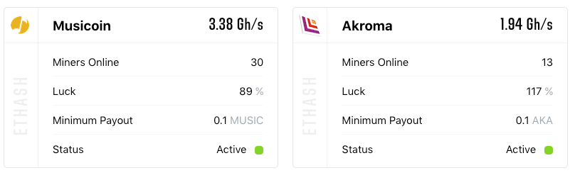 The low number of mining hashrates translates into low profits, and low profits bring a tiny commission. Akroma brings $17 to the pool monthly, while Musicoin brings just $12. The sum is ridiculously small. And there are also expenses on pool maintenance for these coins like developers, servers, etc. that have to be paid out of our own pocket. As a result, it’s easier to let these cryptocurrencies go than continue wasting time and money.