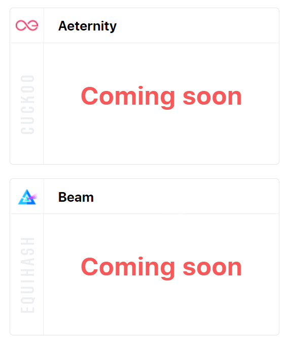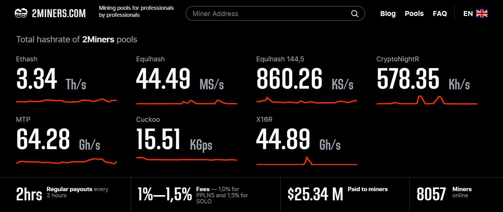 The pool is growing. When 2Miners has started back in 2017, we had just 2 mining algorithms: Ethash and Equihash. Now we already have 7 algorithms implemented: Ethash, Equihash, Equihash 144.5, CryptoNight R, MTP, Cuckoo, X16R. At first, we had a big hashrate chart on the landing page with a color specified for each algorithm. However, the amount of algos was doing this chart unreadable. That’s why we’ve redesigned our landing page to make it simple and clear.