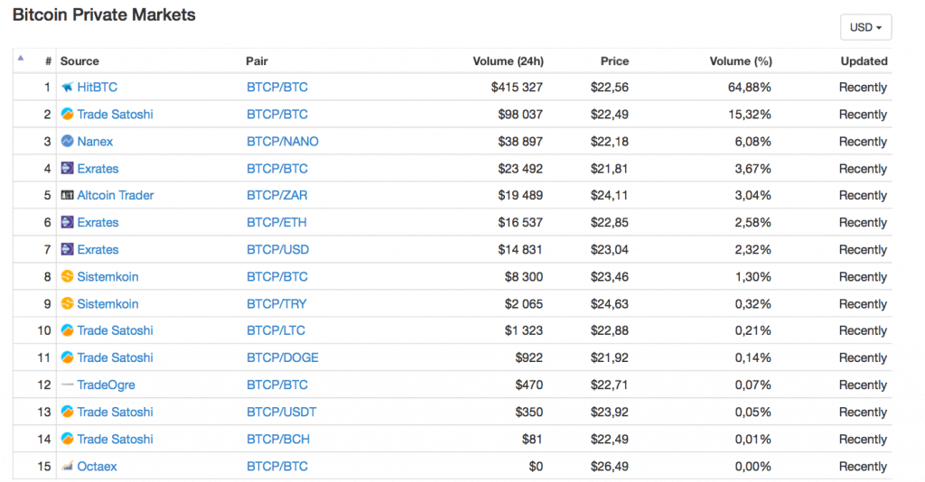 Even though the Bitcoin blockchain was used to create BTCP, they have little in common. To start with, it is not easy to buy Bitcoin Private. According to CoinMarketCap, the coin is traded in 15 pairs on 8 exchanges. The leading market is HitBTC that accounts for 64% of the BTCP trading volume in the last 24 hours.