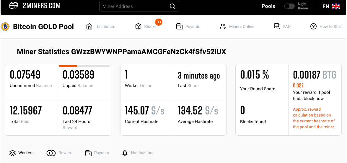 The miner setup is pretty easy. Below you can see the bat file for Bitcoin Gold mining on 2Miners pool.