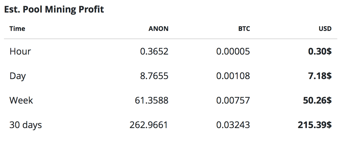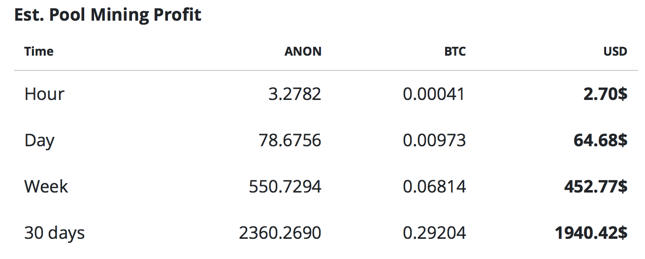 ANON is still too young to be listed on WhatToMine, so we will use Rubin calculator. Let’s take 448 sol/s as an example, which would correspond to a mining rig with 8 Nvidia 1080Ti graphics cards.