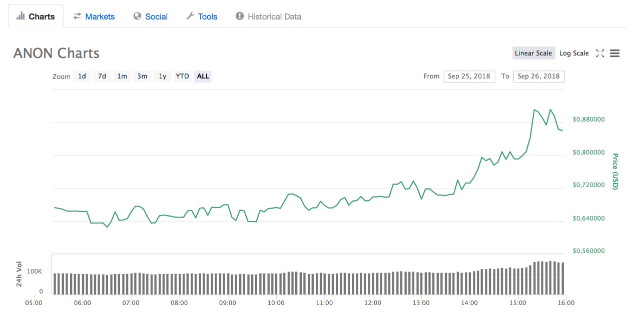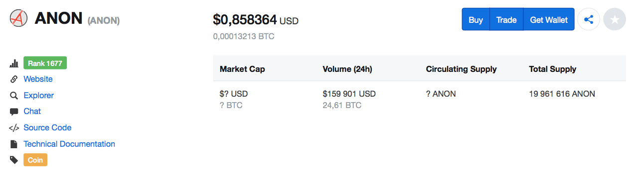 The current exchange rate is $0.85. At the time of the fork, there were around 27 million ANON in circulation. The max volume will amount to 40 million ANON.