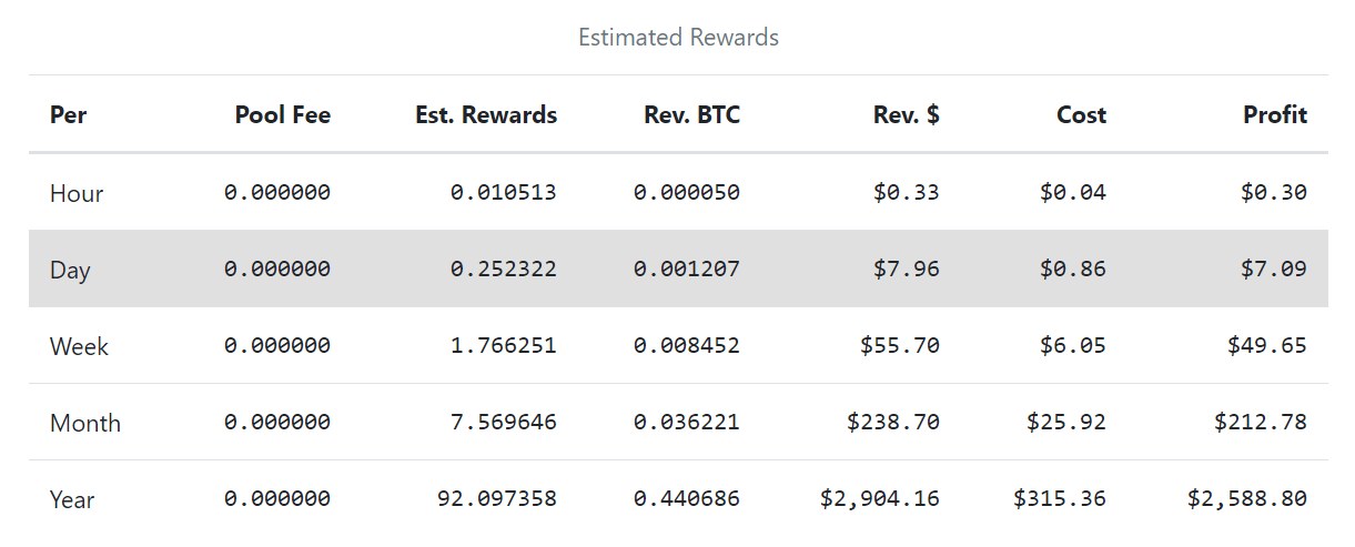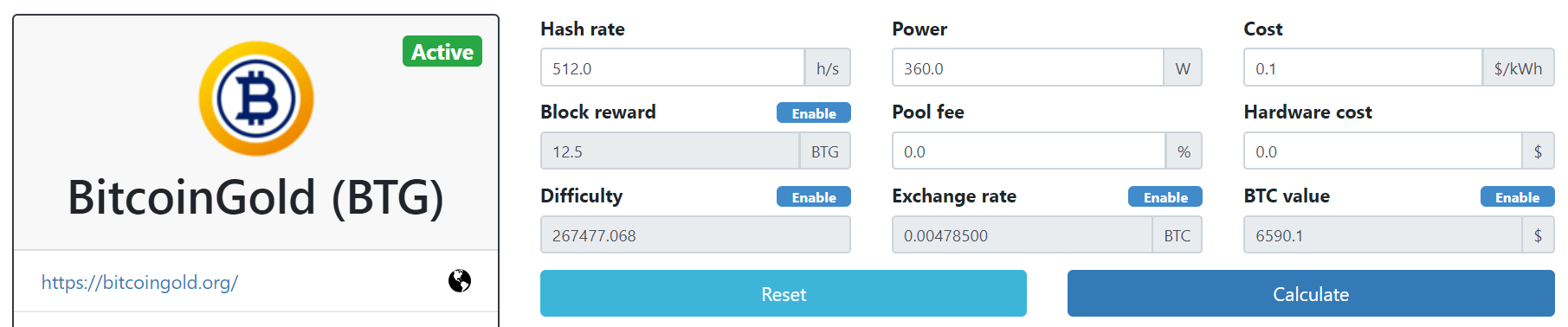 Let’s calculate profitability using WhatToMine. Let’s choose BTG from the list of coins and enter the hashrate of 512 sol/s. This calculation is the hash rate that you can expect from a rig with 8 Nvidia 1080ti graphics cards.