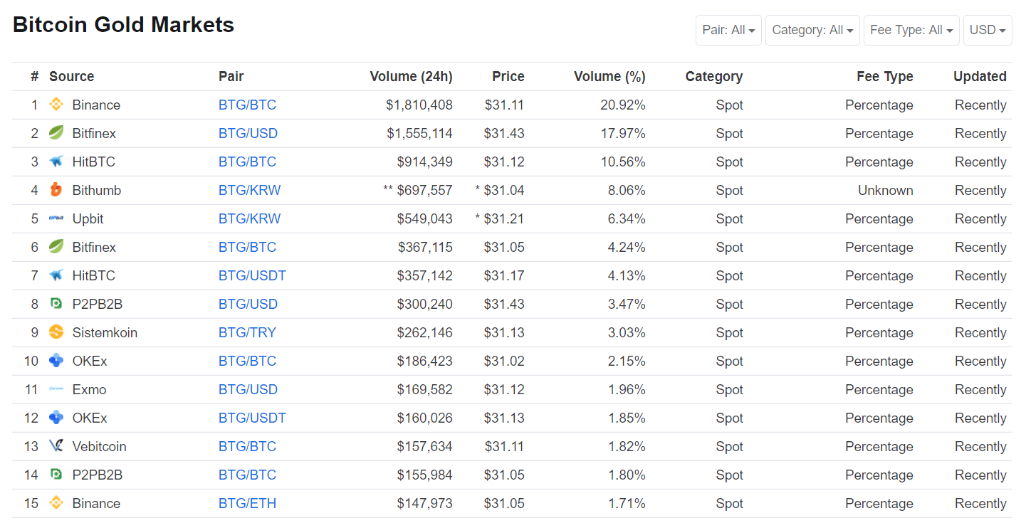 According to CoinMarketCap, the coin is traded in 78 pairs. The most popular transaction is the exchange of BTG to BTC on Binance. Such transactions are equivalent to over 1.8 million dollars.