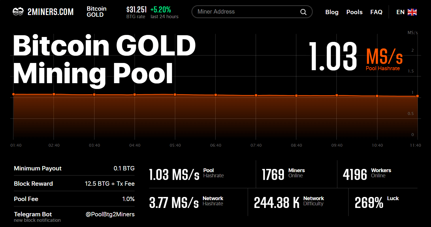 BTG has updated the mining algorithm to Equihash 144,5 at block 536200 at the 3rd of July to prevent the ASIC-mining. Equihash 144.5 is the ASIC resistant algorithm so Bitcoin Gold is mined only with GPU’s at the moment. PPLNS pool and SOLO mining modes are available at 2Miners.