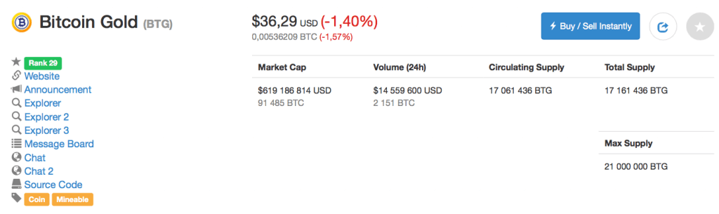 Bitcoin Gold market capitalization is 619 million dollars. The circulating supply is 17.16 million BTG with daily a trading volume of 14.5 million dollars.