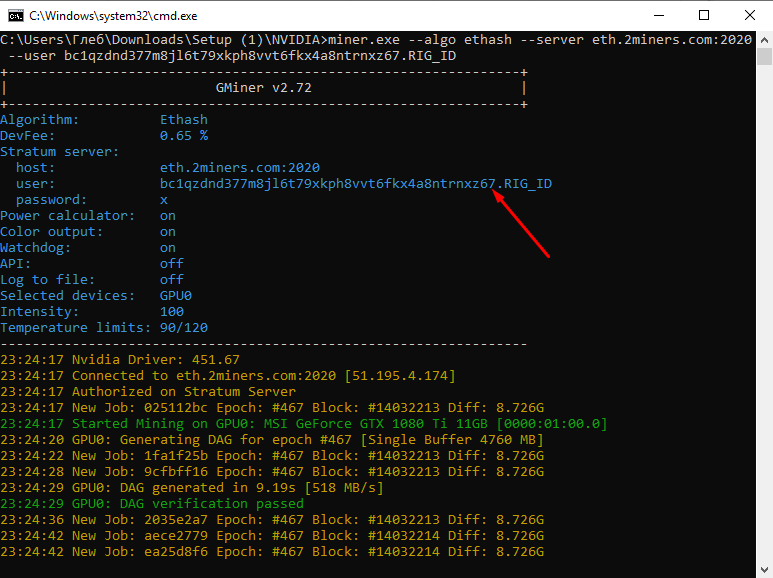 Copy your Bitcoin wallet address that we created in the previous step: bc1qzdnd377m8jl6t79xkph8vvt6fkx4a8ntrnxz67, and paste it after the word “user” replacing a wallet indicated there by default. You can either keep or delete the “.RIG_ID” part including the dot. This is just your rig name, and it doesn’t affect profitability in any way.