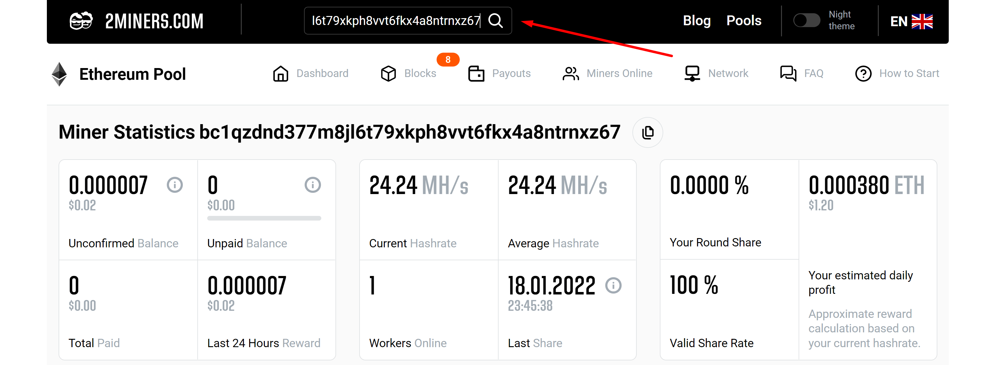 In order to find your mining stats, you need to copy your wallet address: bc1qzdnd377m8jl6t79xkph8vvt6fkx4a8ntrnxz67, and paste it in the search box at the top of the 2Miners.com pool webpage. You will see a page with your stats. If you don’t see it right after you launch the mining program, it’s normal. You should wait for 5–10 minutes.