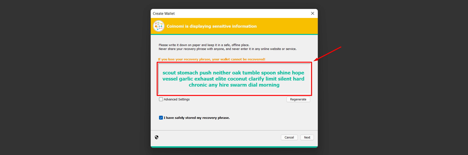 Again, it’s extremely important: this set of words is the key to all your money. Store it in a safe place and don’t show it to anyone. Even if you delete Coinomi from your computer, you will be able to recover your wallet thanks to this phrase.