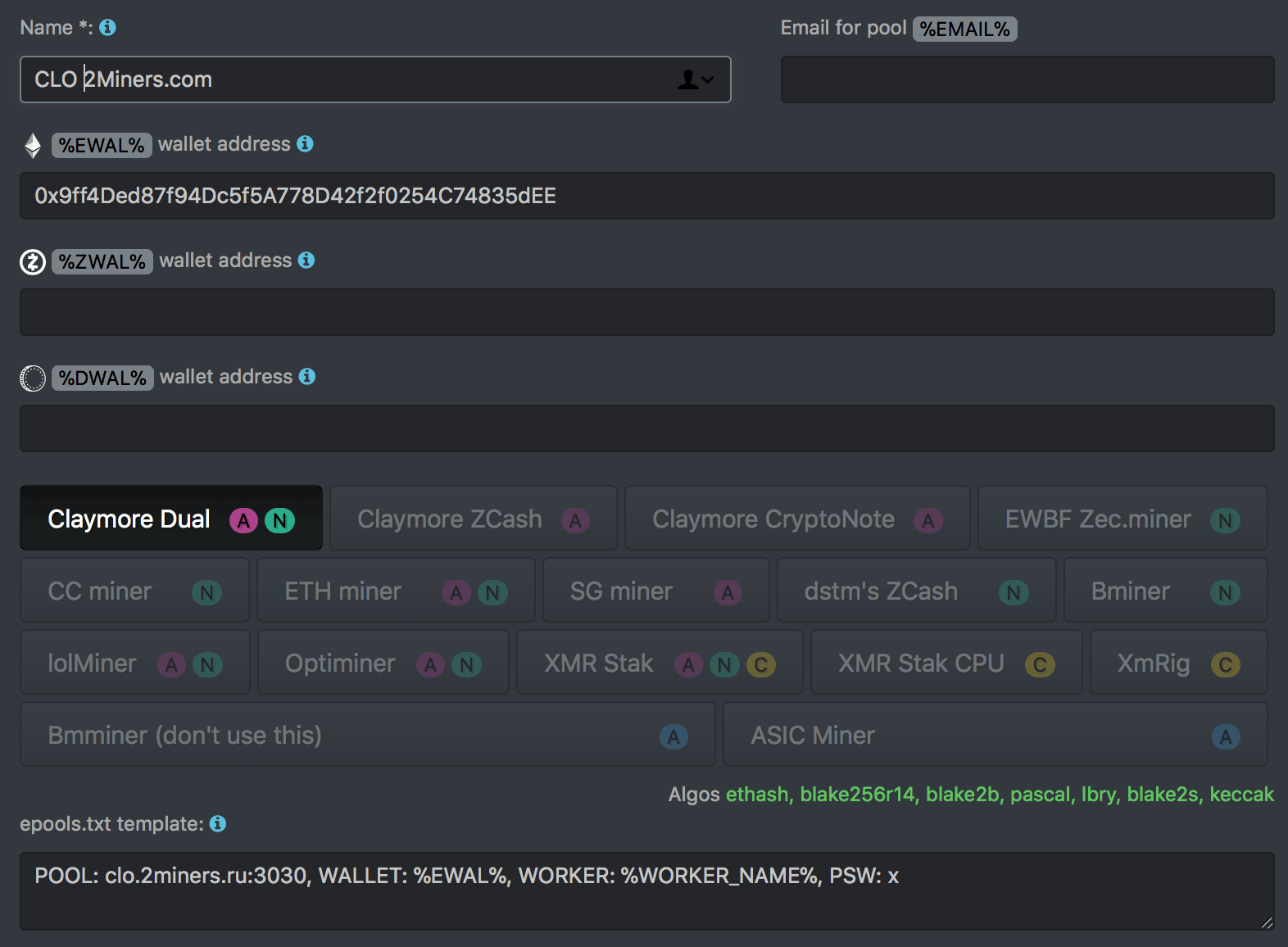 2Miners recommends using Claymore’s Dual Ethereum GPU Miner. It is the best miner for AMD and Nvidia graphics cards to date. Download the latest Claymore version (password for the archive is 2miners) change wallet in the clo-pool.bat file and start mining.