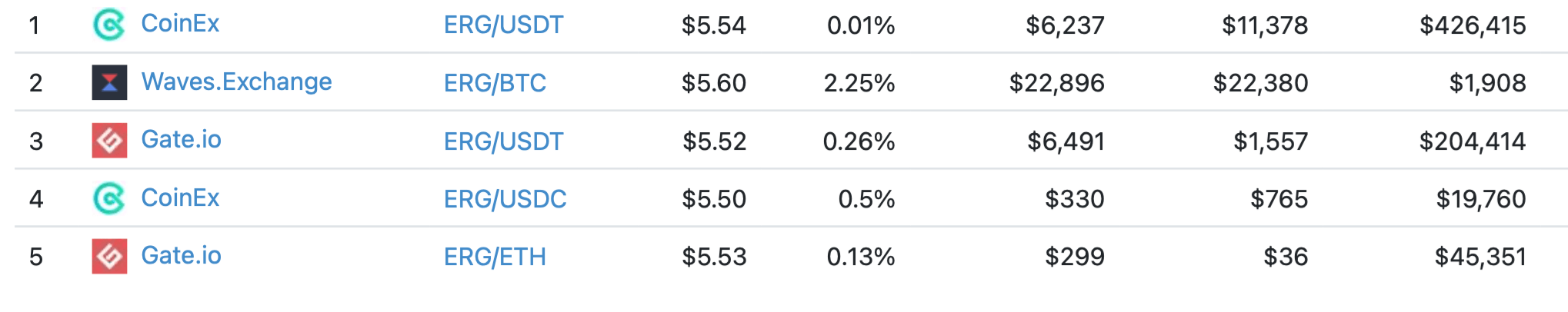 Ergo (ERG) is traded on several popular crypto exchanges: Coinex, Waves, and Gate. According to Coingecko, Waves offers the best liquidity. You need more money to move the ERG exchange rate by 2% in either direction.
