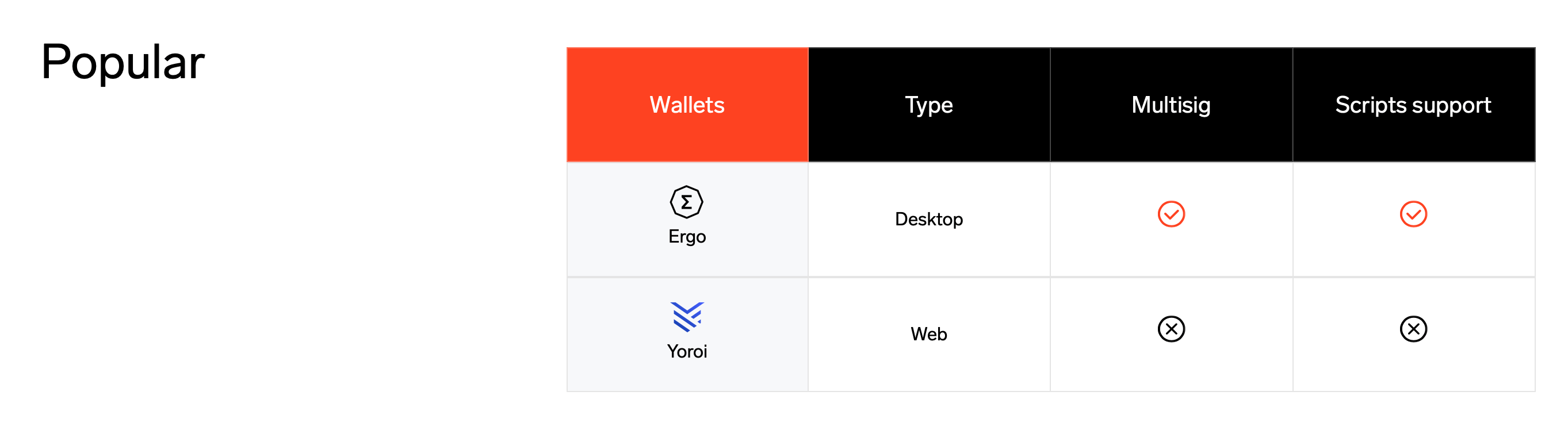 Ergo offers two options: Ergo’s official wallet and Yoroi. The former is a fully functional desktop wallet, whereas the latter works in the web browser. Ergo wallet offers a wider range of options. It has a multi-signature feature that allows you to perform crypto transactions on the wallet only by mutual consent of several people.