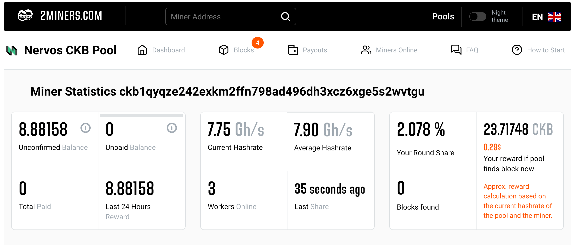 Nervos CKB operates on the Eaglesong algorithm. Block reward is 1133.05 CKB. Nvidia and AMD graphics cards are both suitable for mining.
