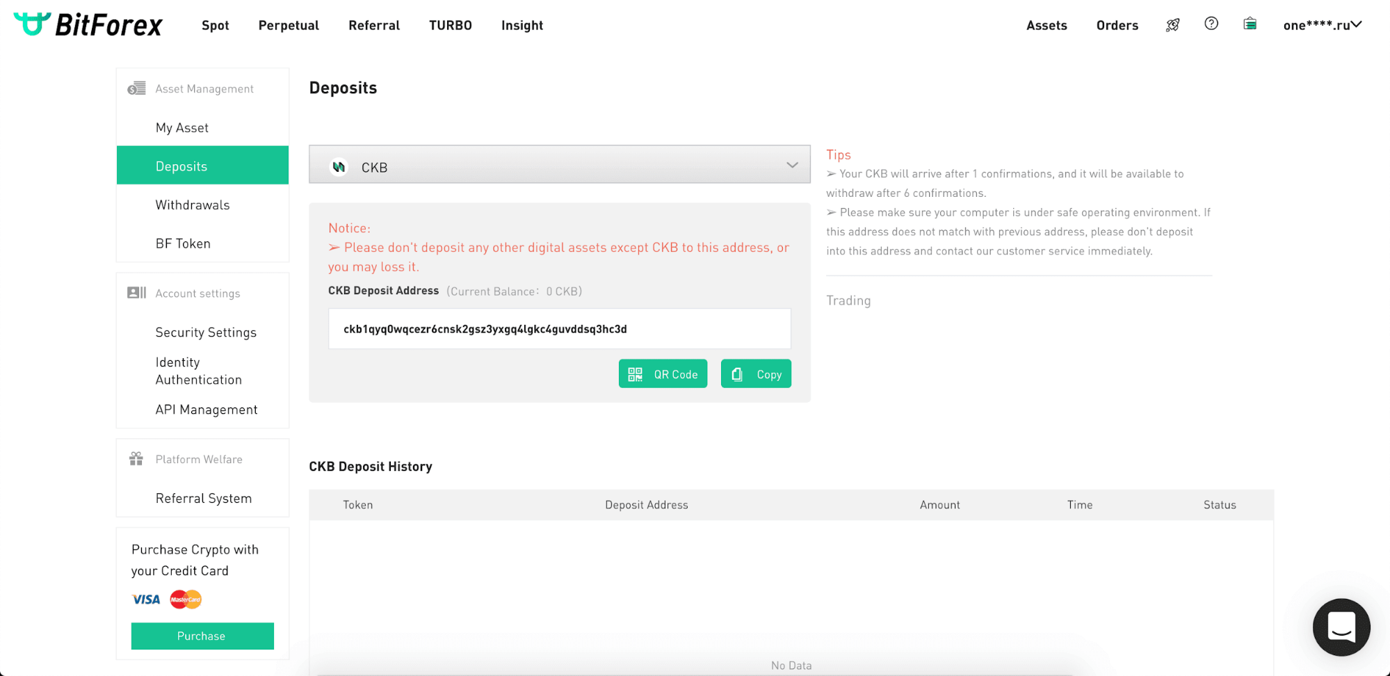 We recommend getting a wallet on an exchange and use it for mining. HotBit and BitForex are a good choice. In the video above, you can see how to register on HotBit. In order to get a wallet, go to the exchange, find CKB and click ‘Create Deposit Address’.