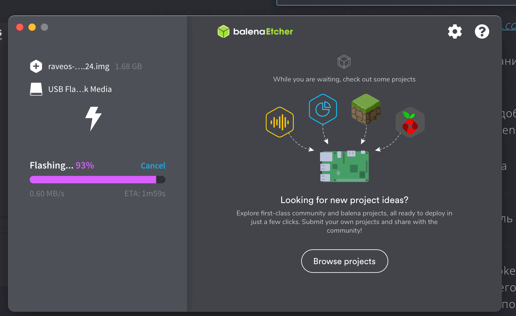 Download RaveOS image. The file size on MacOS is 1.68 GB.