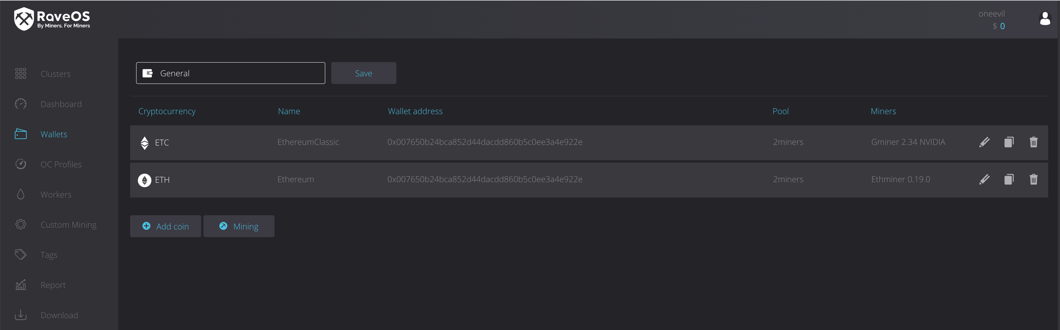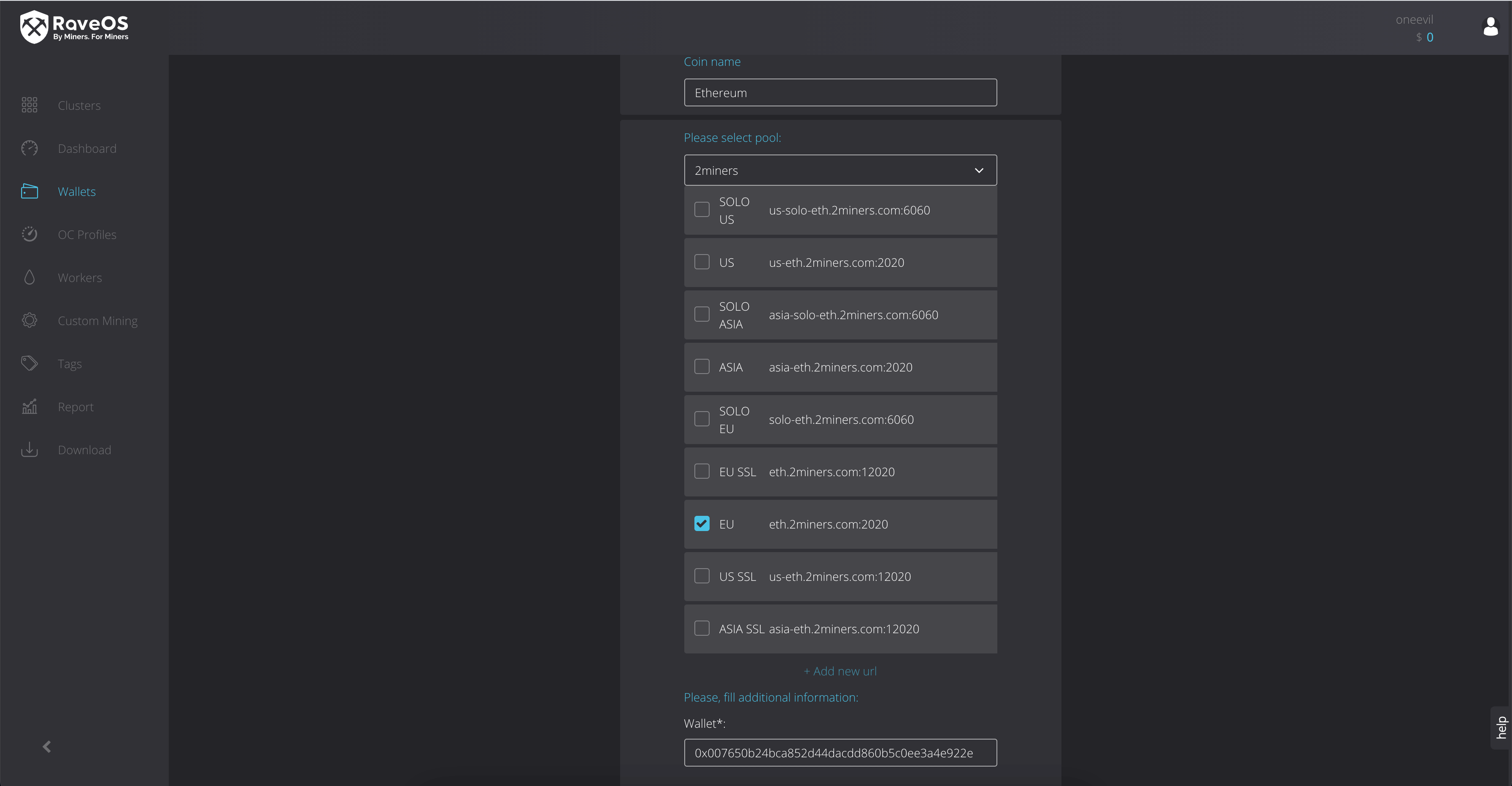 The next step is to add your cryptocurrency wallet address where you want to receive rewards. Go to Wallets in the menu on the left to do that, then choose a coin, mining pool (we recommend 2Miners), and the wallet address.