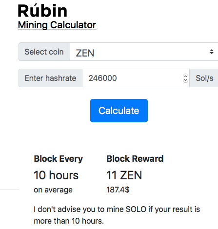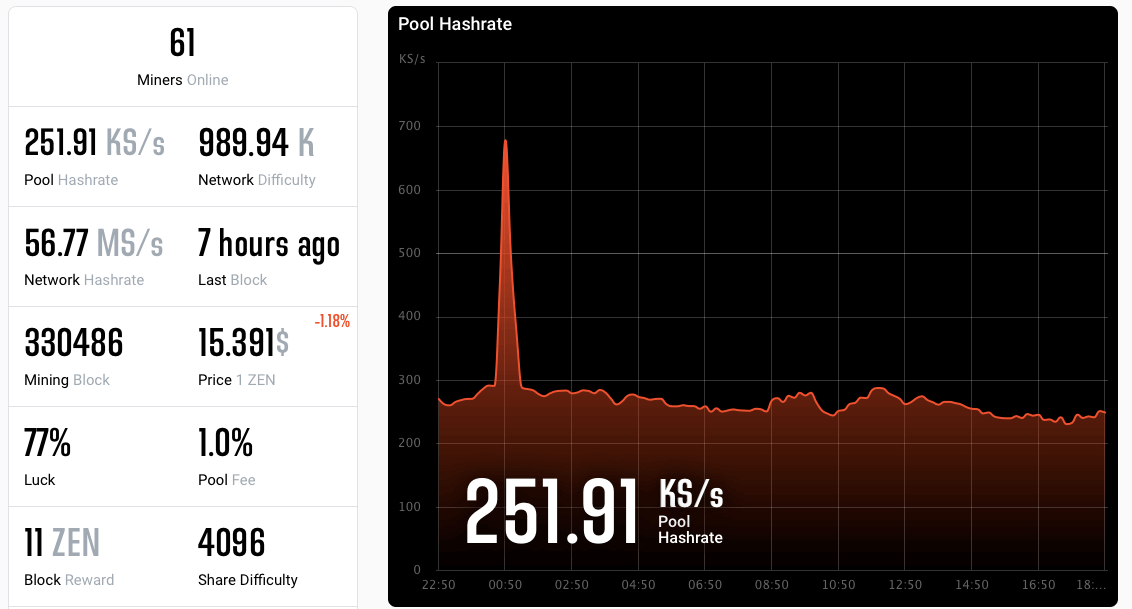 Block find time is 2 min. 30 sec. Miner reward is 11 ZEN, or $171, according to the current exchange rate. On the 28th of June, they reduced miner reward to 8.75 ZEN.