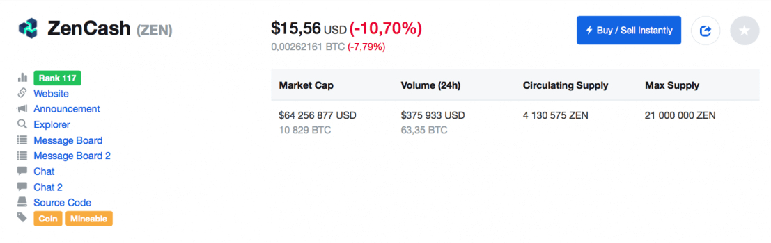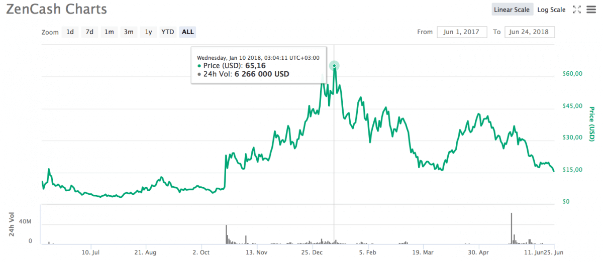 As we write this, ZenCash ranks 117th in the world. Its rate is $15.56 which is 10% lower than the day before. The market capitalization is $64 million.