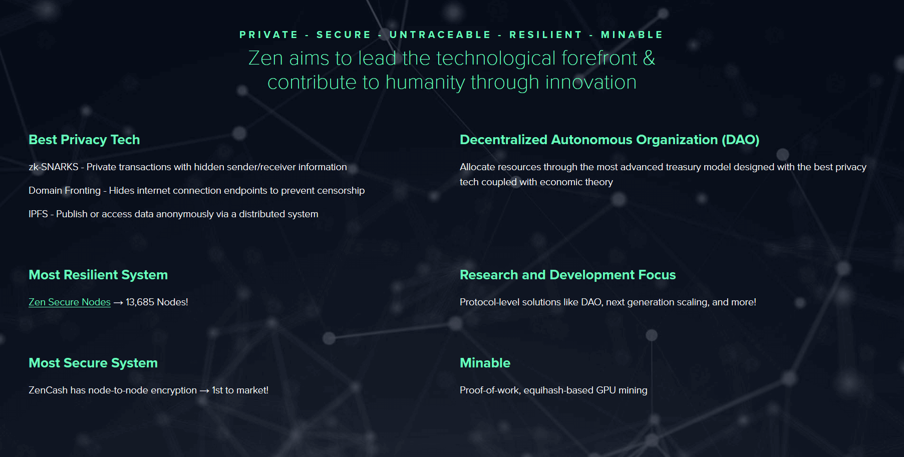 ZEN uses decentralized autonomous organization (DAO) and “the latest privacy technology,” such as zk-SNARKs, Domain Fronting, and IPFS. Their purpose is to hide information about transactors and ensure anonymity. ZenCash seems to do it quite well.
