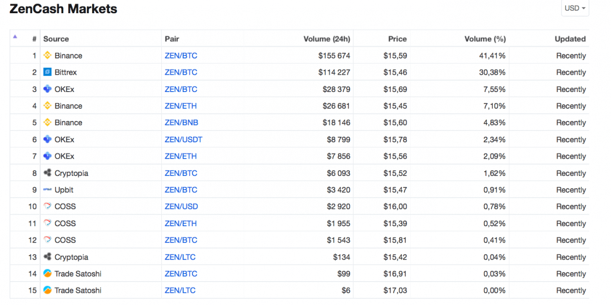 CoinMarketCap lists 15 pairs in which ZEN is traded.