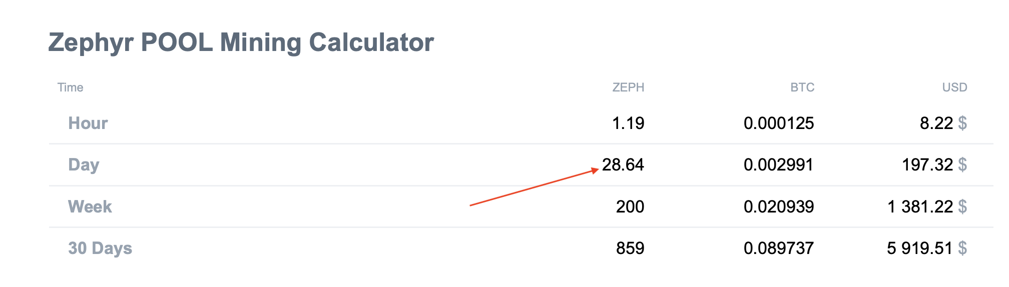 This is logical since Zephyr is primarily intended for CPU mining. So to calculate the current profitability, enter your hashrate on this page.