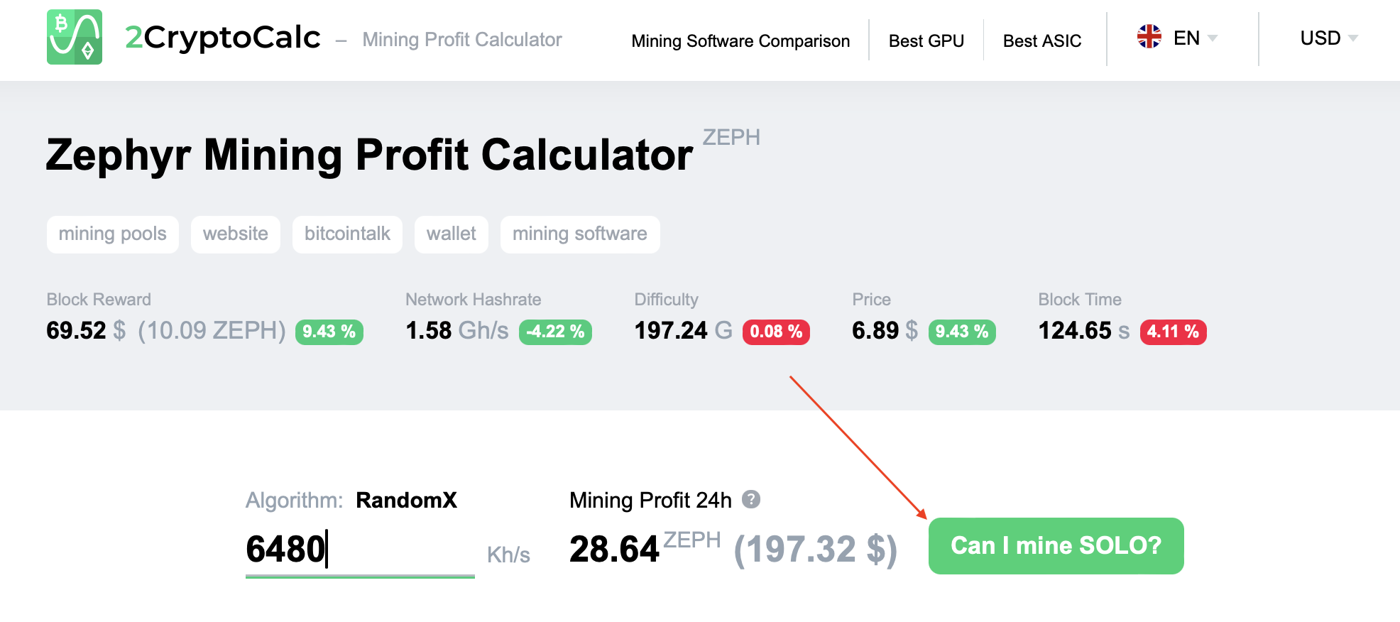 How to check this? Go to this page of the 2CryptoCalc calculator, enter your hashrate, and click the green “Can I mine SOLO” button.
