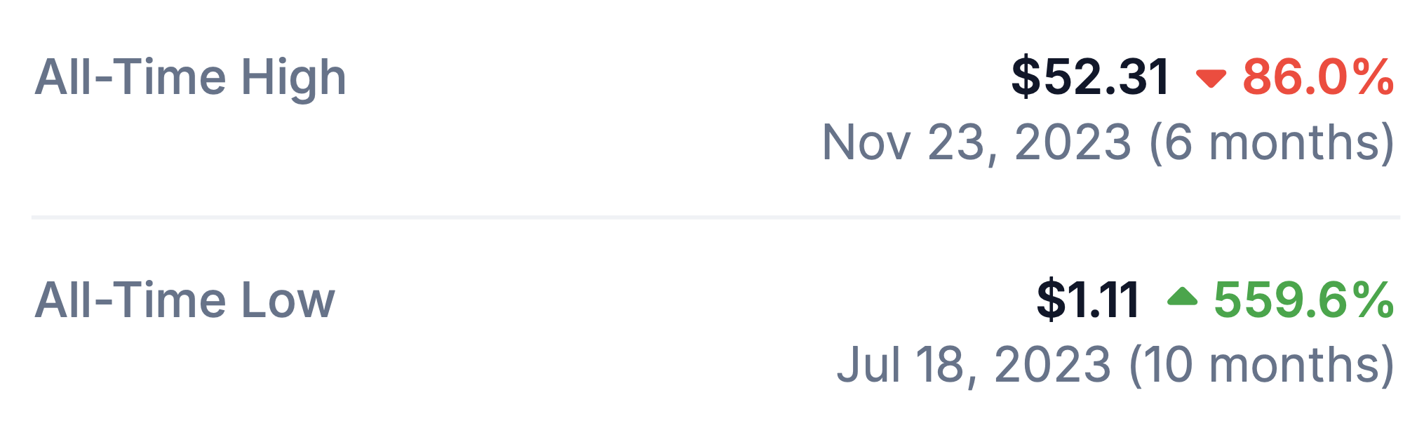 The peak value of the asset at $52.31 was reached on November 23, 2023. Accordingly, compared to that mark, the current rate is 86 percent behind.
