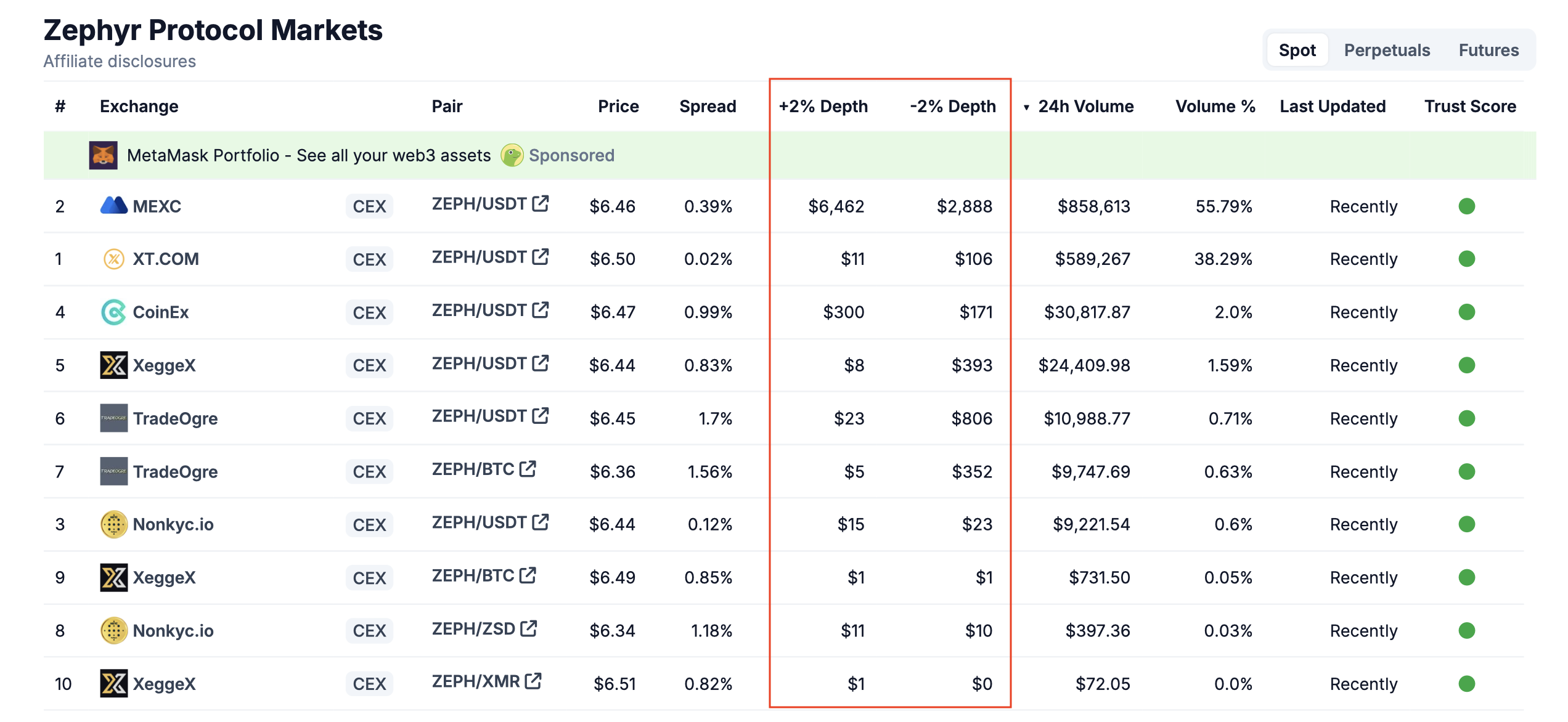 For example, buying ZEPH for 11 USDT on the XT-com platform will increase the coin's rate on the exchange by 2 percent, while a similar decrease on Nonkyc will occur after selling cryptocurrency for $23. Considering this, it is better to conduct transactions with your coins — whether it is buying crypto as a long-term investment or selling mining rewards — on platforms with strong liquidity. In this case, it is the MEXC exchange, which will allow you to conduct transactions on better terms and without sharp rate changes.