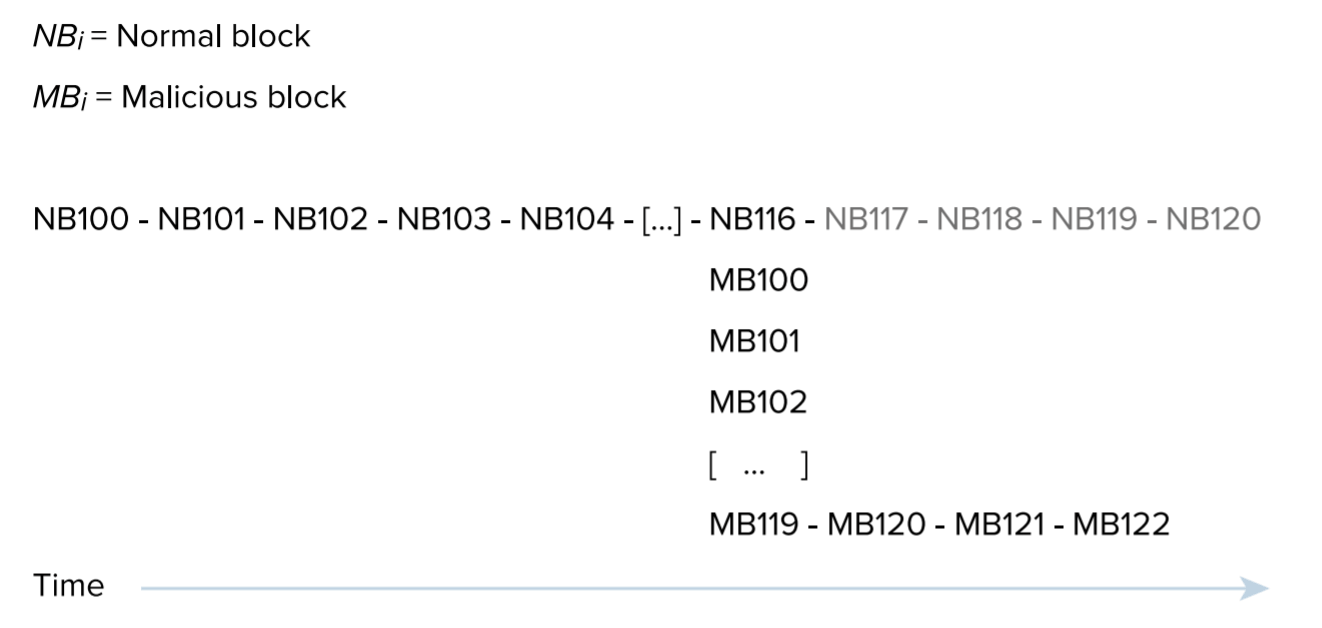 It is a blockchain example where NB stands for Normal Block and MB is Malicious Block. Starting from block NB100, the attacker disconnected his node from the rest of the cryptocurrency network N and started mining his own branch M alone. When the rest of the world reached NB116, the attacker had already mined MB119, that is, he mined 3 blocks more than others. Without protection system, once the attacker reconnects to other nodes, he could make the work of the rest of the world invalid and cancel blocks NB100–NB116, replacing them with MB100–MB119.