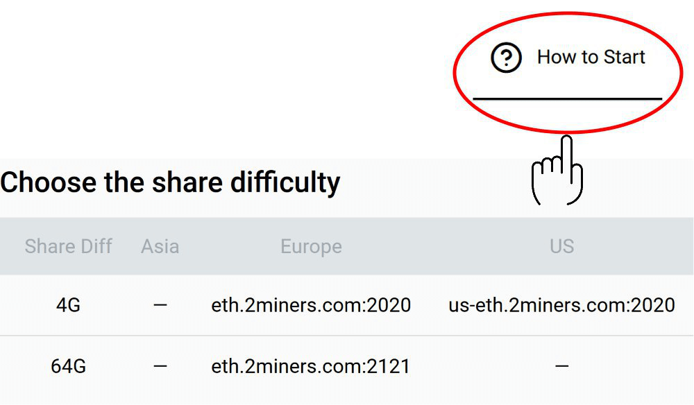 We’ve implemented the different ports with different share difficulty values for every mining pool. Just go to “How to start” section and use the host:port required. Let’s have a look at Ethereum pool for instance: