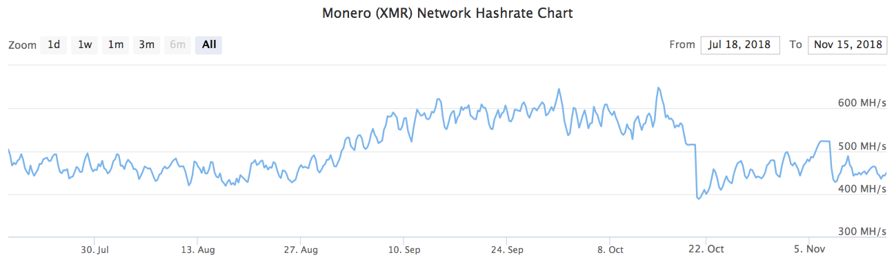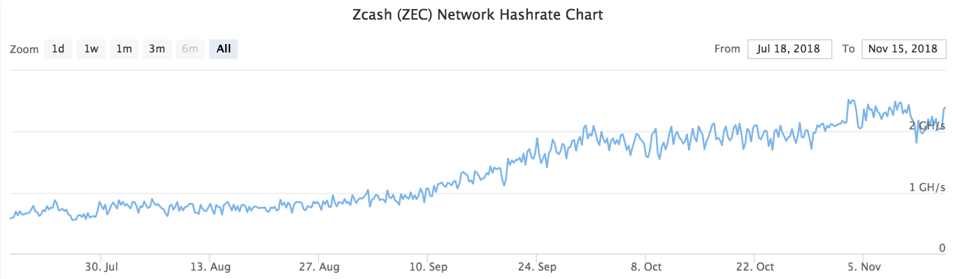 Hashrate reached its peak at the end of August 2018, stagnating afterward.