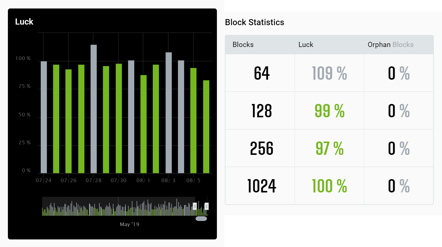 - “Pool finds block when Luck is 100%.” That is not true. Pool finds a block with 100% Luck on average if we take into account many blocks, for example, 1000 blocks. It is not possible to predict the Luck of the next block.