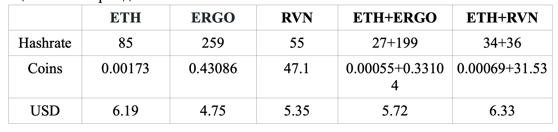As a result of our testing, we got the following hash rates (Mh/s) and estimated respective 24-hour rewards.
